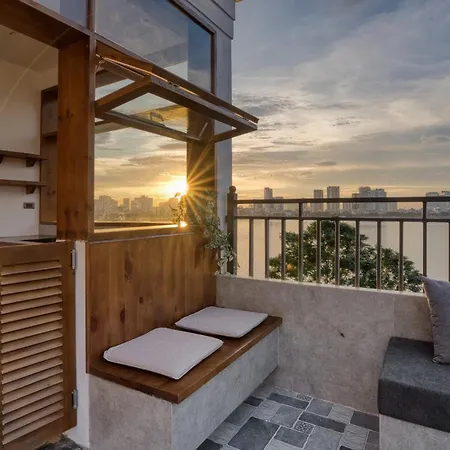 Dentro del apartamento Panorama Lakeview Tranquil - Tay Ho, Ha Noi hay una cocina donde los huéspedes pueden preparar sus propias comidas caseras. Para una estancia más relajante, dispone de una terraza con vistas al jardín.